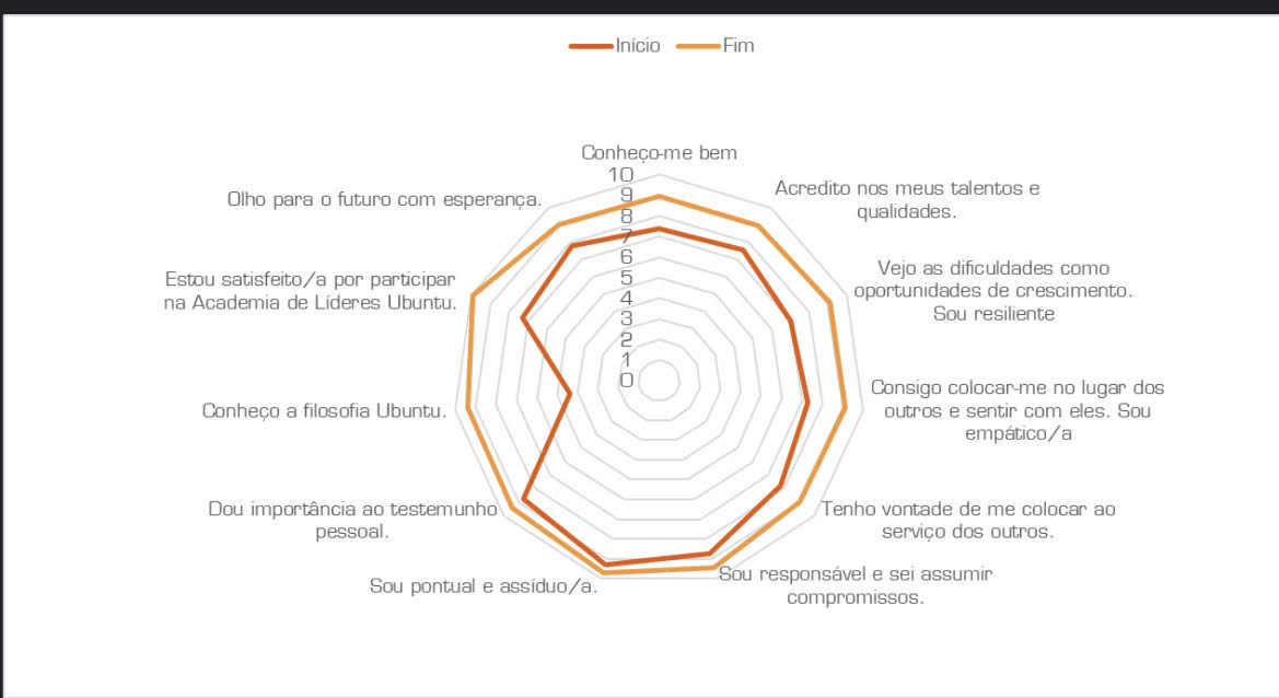 Na avaliação de impacto, efetuada pelas Escolas Ubuntu e que tem em conta as respostas dadas pelos alunos no final da formação, regista-se um incremento significativo nas competências relacionadas com os pilares Ubuntu, como se pode ver na foto.