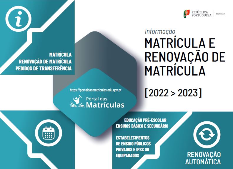 Matrículas para o ano letivo 2022-2023 para a Educação Pré-Escolar e 1º ano do 1º Ciclo do Ensino Básico entre 19 de abril e 16 maio de 2022. Mais Informações AQUI.